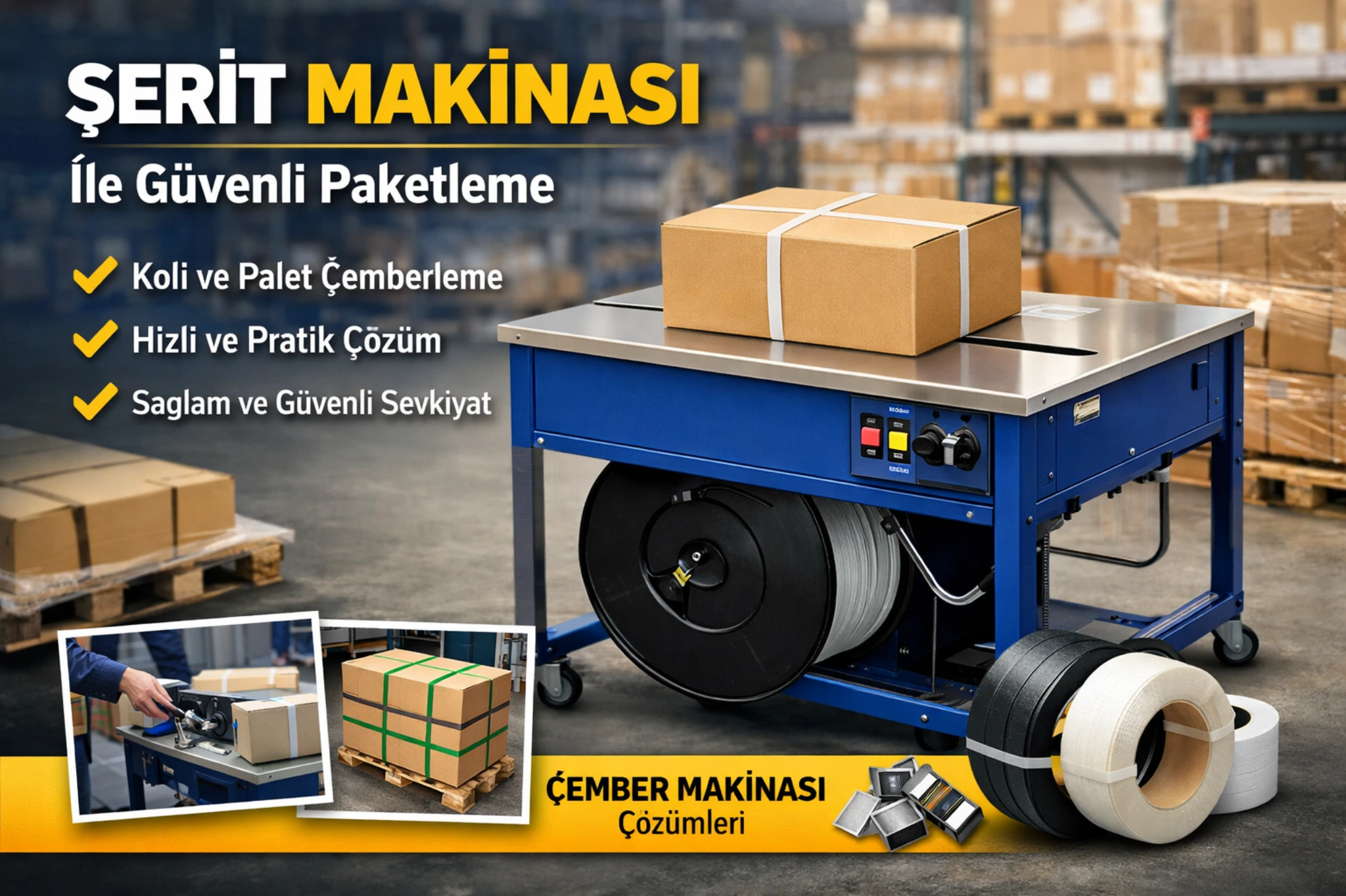 Bu makineler, ürünlerin etrafına bir çember oluşturarak ve bunları sıkıca bağlayarak ambalajlama işlemini gerçekleştirir.