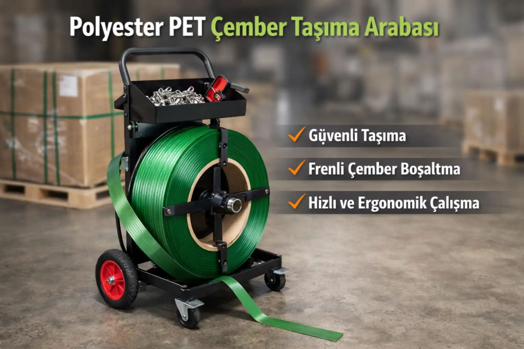 Kompozit çember, özellikle ağır paletlerin güvenli sabitlenmesinde ve uzun sevkiyatlarda tercih edilir. Bu tarafta taşıma arabası seçimi “saha düzeni” ile doğrudan ilişkilidir: bukle toka, gerdirme aparatı, köşebent ve kesici gibi ekipmanlar çoğu zaman aynı noktada kullanılacağı için hazneli tasarımlar fark yaratır. Bobin açılırken çemberin lif dokusuna zarar vermemesi için mil yüzeyi ve kılavuz akışı önemlidir. Dayanıklı teker ve dengeli gövde, engebeli zeminlerde bile iş güvenliğini artırır.