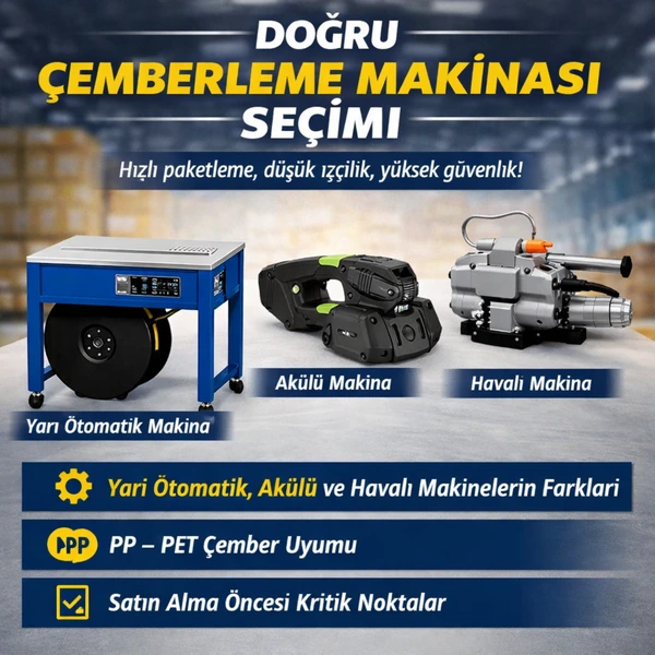Depo, üretim hattı, sevkiyat alanı… Nerede paketleme yapıyorsanız, yükünüzün güvenli kalması için doğru çember makinası seçimi kritik hale gelir. Bu yazıda; çemberleme makinaları dünyasını sade ve “sahada işe yarar” şekilde anlatıyor, hangi işletmenin hangi makine tipinden daha çok verim alacağını netleştiriyoruz. Ayrıca PP/PET/çelik/kompozit gibi malzemelere göre uyumu, uygulama ipuçlarını ve satın alma öncesi dikkat edilmesi gereken teknik noktaları tek bir rehberde topluyoruz.