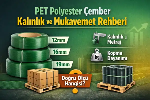 PET Polyester Çember kalınlık ve mukavemet rehberi, paketleme ve palet bağlama süreçlerinde doğru çemberi seçmek isteyen işletmeler için pratik bir yol haritasıdır. Doğru genişlik/kalınlık seçimi; taşıma sırasında yükün dağılmasını, paletin “yürümesini”, köşe deformasyonunu ve gevşemeyi azaltır. Aynı zamanda gereksiz yüksek mukavemet seçerek maliyeti artırmadan, işi güvenle çözecek optimum değeri yakalamanızı sağlar. Bu rehberde 12mm–16mm–19mm PET çember aralığında kalınlık, metraj ve kopma dayanımı (mukavemet) ilişkisini; sektör senaryolarıyla ve teknik verilerin mantığıyla ele alıyoruz. Konu boyunca seçim kriterlerini netleştirip, “hangi yükte hangi ölçü” sorusunu hızlı cevaplayacak bir bakış açısı kazanacaksınız.
