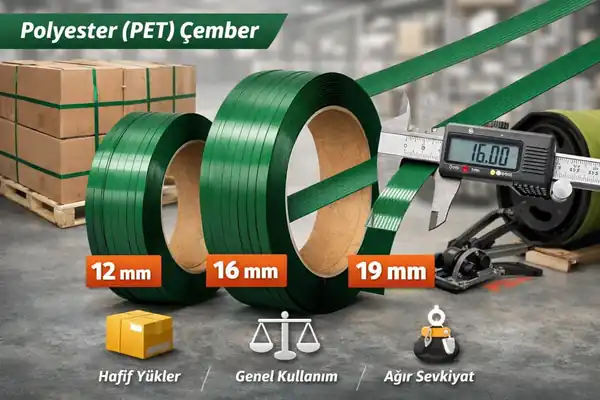 Kullandığınız çemberleme makinası/aletin desteklediği çember genişliği aralığını kontrol edin. Sonrasında yük profiline göre 12–16–19 mm kararını verin.